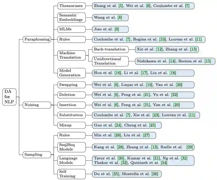 数据增广(Data Augmentation,DA)方法通过产生用于模型训练的新数据,来缓解深度学习任务中可能存在的数据稀缺问题。DA方法较早被应用在CV领域,近年来,其在自然语言处理任务中也得到了越来越多的关注。当下,DA方法种类繁多,而自然语言处理的任务又多种多样、各具特点和挑战,这导致研究者常常难以选择合适的DA方法,或跟进相关进展。
