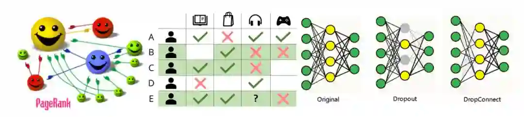 图1:机器学习与深度学习中关系建模的不同体现,即网页检索中不同网页之间的关系、推荐系统中用户和商品之间的关系、神经网络中不同节点之间的关系。