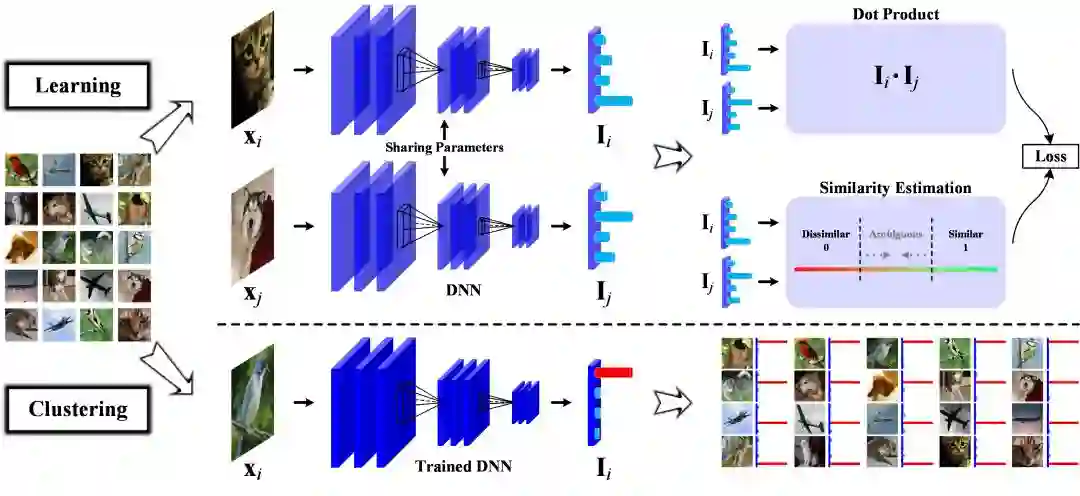 为了用深度学习模型更好地处理大量的无标签数据,我们通过研究两两样本之间的关系来处理聚类问题。通过逐渐确定同类和不同类的样本来训练网络,提出的DAC模型可以直接学习数据的高层语义特征进行聚类分析。从基本定义来看,聚类的目的是将相似的数据聚为同类,将不相似的数据聚为不同类。根据以上定义,我们通过讨论成对样本之间的相关性来将每个样本映射为one-hot的向量以实现聚类的目的。在实际中,该模型不仅可以处理多种数据的聚类任务,例如:图像,文本,音频等等,还有着很好的理论基础来保证模型的有效性。算法流程图如下图所示。