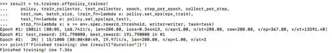 天授提供了训练函数onpolicy_trainer和offpolicy_trainer。当策略达到终止条件时,他们会自动停止训练。由于DQN是无策略算法,我们使用offpolicy_trainer。