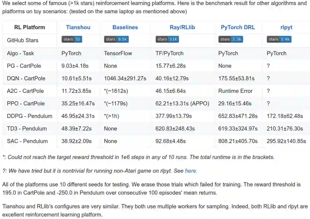 1、速度快,整个平台只用1500行左右代码实现,在已有的toy scenarios上面完胜所有其他平台,比如3秒训练一个倒立摆(CartPole)。