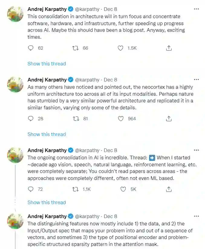 Andrej Karpathy:人工智能领域正在进行的整合令人难以置信。十年前,视觉、语音、自然语言、强化学习等,是完全独立的;一个人很难读懂跨领域的所有论文——各领域方法完全不同,甚至未必基于机器学习。到2010年,所有这些领域开始过渡到 1)机器学习,特别是2)神经网络。虽然架构多种多样,但至少论文读起来开始有点相似,都在利用大规模数据集,都在进行神经网络的优化。