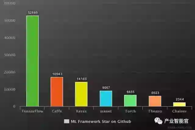 自从2015年11月开源以来,TensorFlow迅速在众多的机器学习框架中脱颖而出,在Github上获得了最多的Star。下图统计了Github上流行的机器学习框架的Star数量: