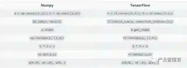 TF使用Tensor表示所有数据,相当于Numpy中的ndarray,0维的数值、一维的矢量、二维的矩阵到n维数组都是Tensor。相对于Numpy,TensorFlow提供了创建张量函数的方法,以及导数的自动计算。下表对比了Numpy和TensorFlow的基本用法。
