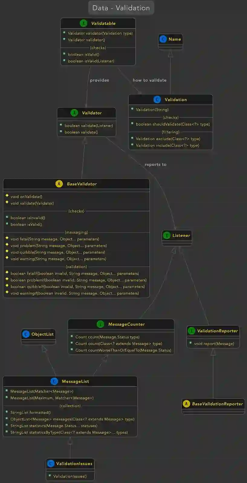public class User implements Validatable{String name;[...]@Overridepublic Validator validator(ValidationType type){return new BaseValidator(){@Overrideprotected void onValidate(){problemIf(name == null, "User must have a name");}};}}public class MyComponent extends BaseComponent{public void myMethod(){var user = new User("Jonathan");if (user.isValid(this)){[...]}}}