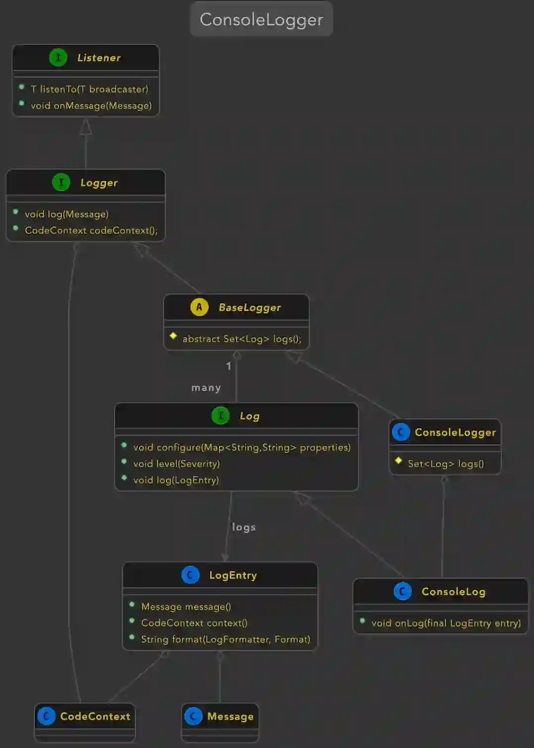 public class ConsoleLogger extends BaseLogger{private Log log = new ConsoleLog();@Overrideprotected Set<Log> logs(){return Sets.of(log);}}public class BaseLogger implements Logger{void onMessage(final Message message){log(message);}public void log(Message message){[...]for (var log : logs()){log.log(entry);}}}public class ConsoleLog extends BaseTextLog{private Console console = new Console();@Overridepublic synchronized void onLog(LogEntry entry){console.printLine(entry.message().formatted());}}
