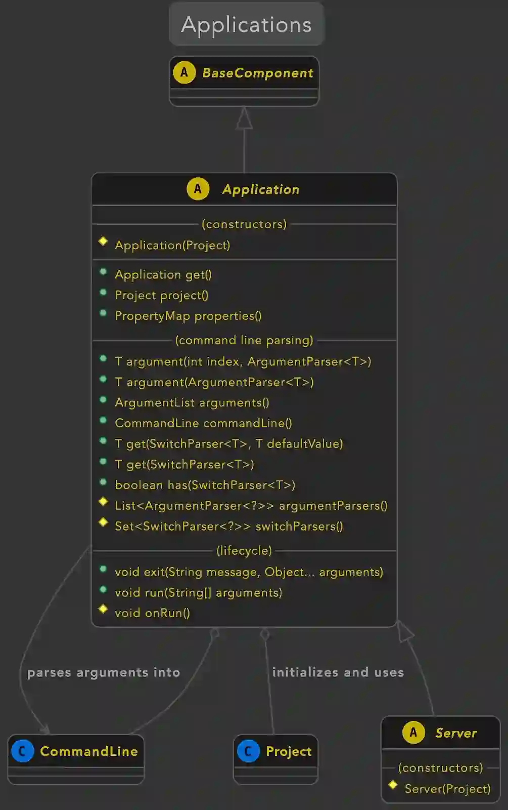 此处的 main() 方法创建应用程序,并使用从命令行传递的参数调用 Application 基类中的 run() 方法。之后微服务的构造器将一个 Project 对象传递给超类构造器。此对象用于初始化包含应用程序的项目以及它所依赖的任何其他项目。继续看我们的例子,我们的 Project 类看起来像这样: