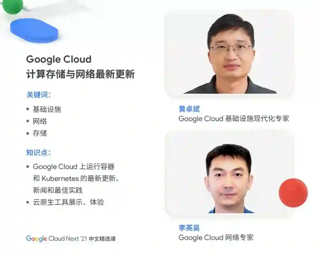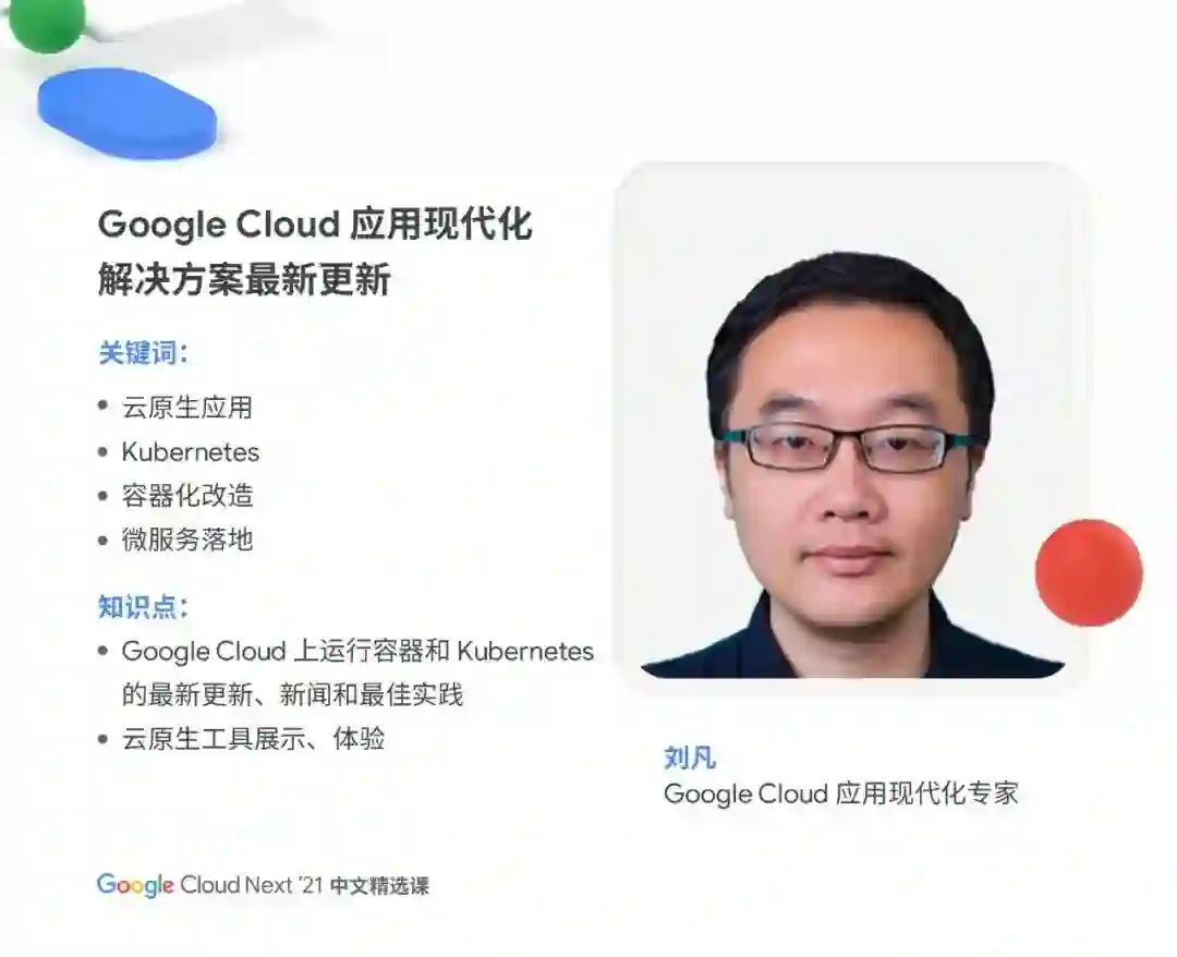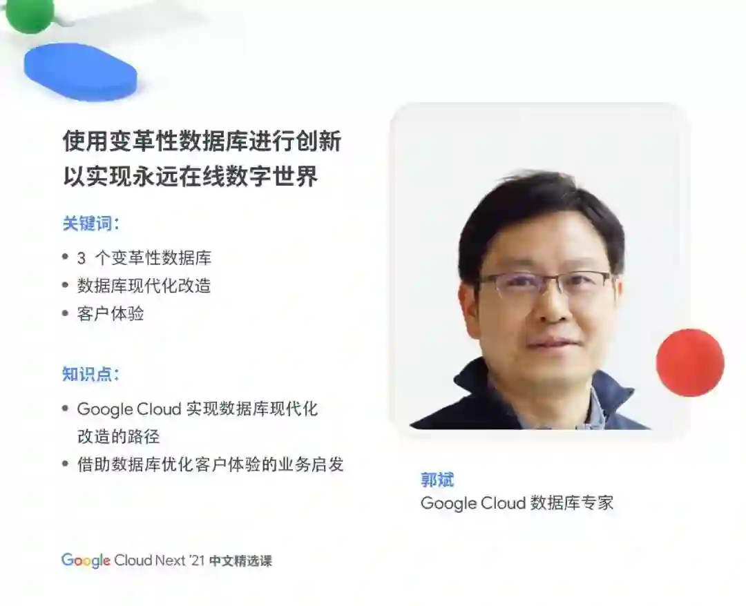 Google Cloud Next '21 中文精选课将于 11 月 16 日上午 11:30 ,在谷歌开发者大会专题演讲区正式开课!6 位 Google Cloud 技术专家,将聚焦"基础设施、应用现代化、AI、数据分析、数据库" 5 大话题,剖析前沿技术,分享最佳实践案例,探讨未来发展趋势。