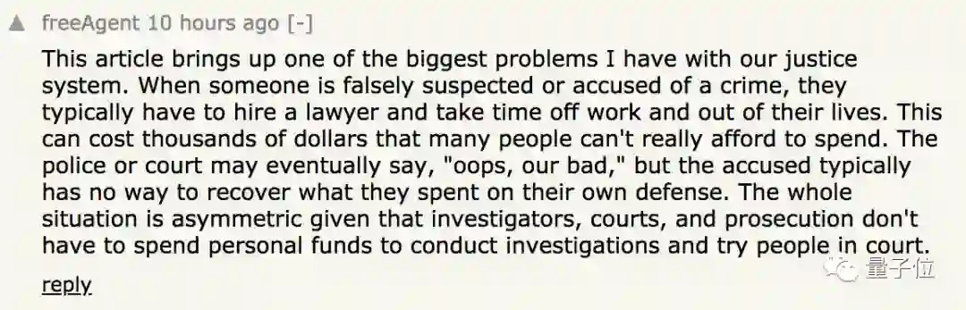 也有人评论认为,这是美国司法系统的bug,当一个人被误认为是犯罪嫌疑人的时候,必须自掏腰包请律师证明自己清白,但弄错的警察却不用自己个人掏钱请律师起诉,这是不对等的。