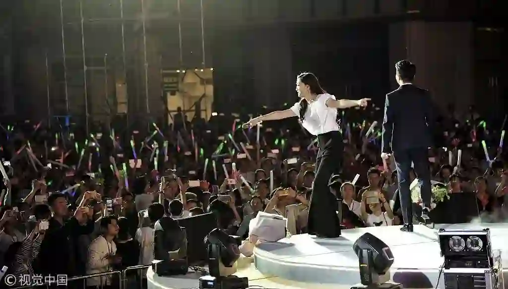 2017年5月,凤凰传奇组合魏玲花、曾毅在贵阳某楼盘演出。©视觉中国