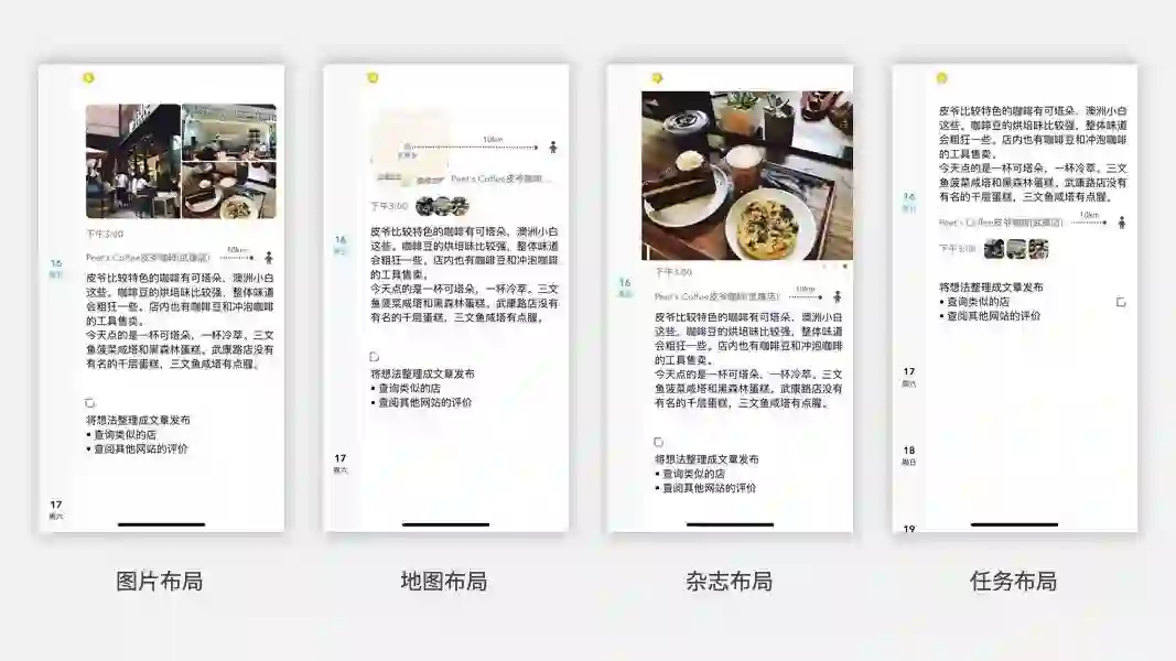 到晚上写日记的时候,再打开笔记,在日记下做细化的填写。添加拍的照片、当时的具体感受,方便以后的回顾。再针对 Todo 待办的部分,整理接下来需要做的事,如查询一些类似的咖啡店、查阅下其他点评网站的评价等等。这样一来,一天的日记就安排上了,满满当当。从随手的笔记,到细化的日记,比原先写日记的压力小多了。