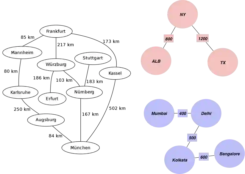 edgelist = [['Mannheim', 'Frankfurt', 85], ['Mannheim', 'Karlsruhe', 80], ['Erfurt', 'Wurzburg', 186], ['Munchen', 'Numberg', 167], ['Munchen', 'Augsburg', 84], ['Munchen', 'Kassel', 502], ['Numberg', 'Stuttgart', 183], ['Numberg', 'Wurzburg', 103], ['Numberg', 'Munchen', 167], ['Stuttgart', 'Numberg', 183], ['Augsburg', 'Munchen', 84], ['Augsburg', 'Karlsruhe', 250], ['Kassel', 'Munchen', 502], ['Kassel', 'Frankfurt', 173], ['Frankfurt', 'Mannheim', 85], ['Frankfurt', 'Wurzburg', 217], ['Frankfurt', 'Kassel', 173], ['Wurzburg', 'Numberg', 103], ['Wurzburg', 'Erfurt', 186], ['Wurzburg', 'Frankfurt', 217], ['Karlsruhe', 'Mannheim', 80], ['Karlsruhe', 'Augsburg', 250],["Mumbai", "Delhi",400],["Delhi", "Kolkata",500],["Kolkata", "Bangalore",600],["TX", "NY",1200],["ALB", "NY",800]]