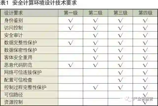 安全计算环境,包括工业控制系统0~3层中的信息存储、处理及实施安全策略的相关部件。安全计算环境按照保护能力划分为第一级安全计算环境、第二级安全计算环境、第三级安全计算环境和第四级安全计算环境,安全计算环境设计技术要求逐级增强,各等级要求如表1。