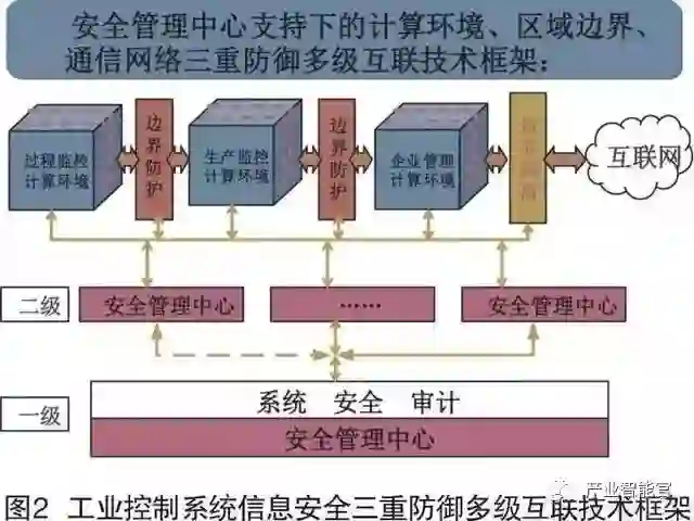 工业控制系统的等级保护防护方案设计参照以往构建在安全管理中心支持下的计算环境、区域边界、通信网络三重防御体系,采用分区的架构,结合工业控制系统总线协议复杂多样、实时性强、节点计算资源有限、设备可靠性要求高、故障恢复时间短、安全机制不能影响实时性等特点进行设计,以实现可信、可控、可管的系统安全互联、区域边界安全防护和计算环境安全,如图2所示。
