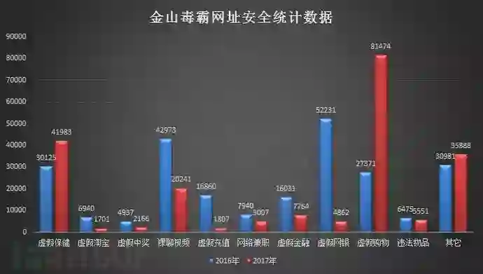 根据金山毒霸网址安全中心提供的数据显示,2017年虚假购物平台的钓鱼攻击,呈翻倍增涨趋势。造成了严重的网络交易安全隐患,广大网民的利益也因此受到了严重损害,不法分子利用虚假购物网站直接盗取用户的支付宝或银行账号或者以超低价格设置消费陷阱的山寨购物网站,以低价、打折等吸引买家上当。其危害性之大,不言而喻