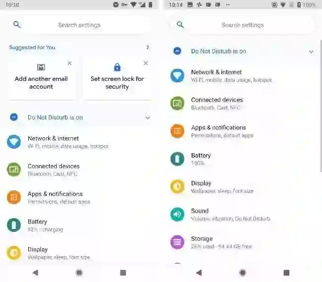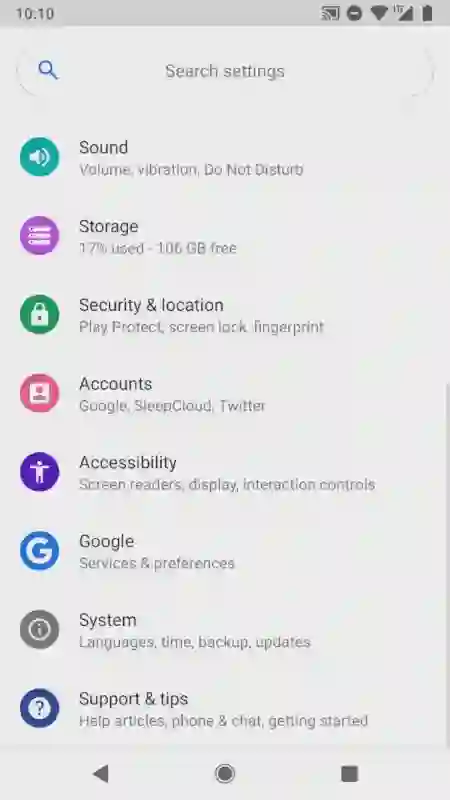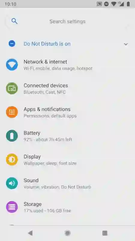 Android P DP1 一改 Android 8.x 中朴素的黑、白、灰三色风格,不仅为快速设置面板的开关加上了圆形的蓝色背景托盘,系统设置界面中所有一级设置条目的图标也都有了色彩各异的圆形背景(如下图)。虽然有不习惯的原生 Android 用户将其戏称为「 TouchWiz Google Play Edition 」,但有了色彩的 Android 系统的确更加活泼了。