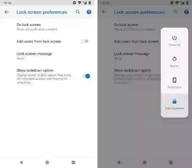 关于电源按键菜单,新增的另外一项功能叫做「锁定模式」,在 安全性和位置信息 - 锁屏时的偏好设置中找到并打开 Show lockdown option 之后,我们就能在锁屏时通过长按电源键,然后点击进入锁定模式 按钮来进行锁定。