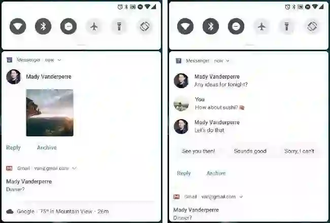 再比如通知。除了在设计上对消息通知布局进行重构并加入智能回复功能以外,Android P DP1 还将通知面板整体变成了一个与上方快速设置面板相互隔离的圆角卡片,每条以 Headsup 形式弹出的通知顶部也采用了同样的圆角设计。