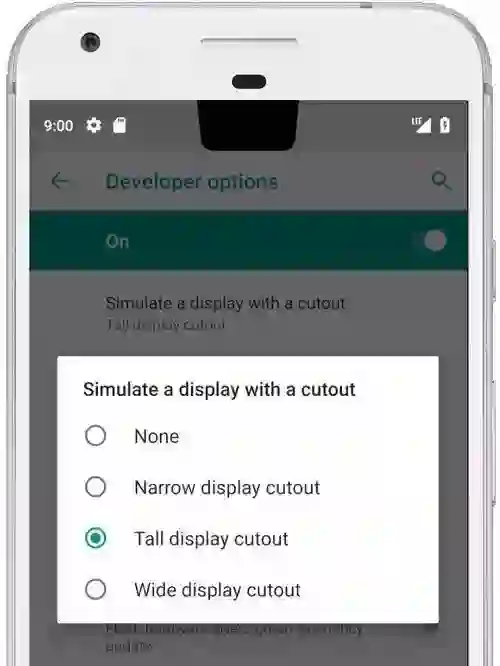 这个选项位于 系统设置 - 显示 中,在此前的 Android O 开发者预览版本中曾用于提供 Pixel 、反色等主题选项。而在 Android P DP1 ,除了 Pixel 以外,其他几个选项都是不同样式的切割( cutout )主题,开发者应该可以借助这一选项对所开发应用的异形屏兼容性进行调试。