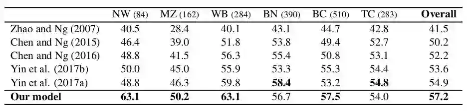 从结果中,我们不难看出,我们的方法是整体显著优于基准系统方法的在不同源的语料上测试,我们的方法能够在大部分来源的语料上超越基准系统,尤其是在文本数目最大的BC语料上,我们的方法优于所有的基准系统。综上所述,我们提出的基于强化学习的中文零指代消解算法能有效够提升中文零指代消解的效果。