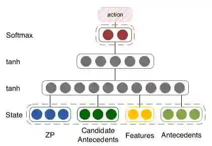 这里 vzp 和 vnpt是零代词 zp 和候选先行语 npt 在时间 t 的向量表示。另外,我们还引入了一些人工设计的特征向量 vfeaturet 进行计算,这些特征都是从以往的零代词消解工作中得到的(Zhao and Ng, 2007; Chen and Ng, 2013; Chen and Ng, 2016)。vante(t)表示先行词信息,这些信息是从之前被判断为正例的先行词中得到的。之后,我们把这个向量当做状态,然后放入后续的深度强化学习智能体(Agent)来产生动作。