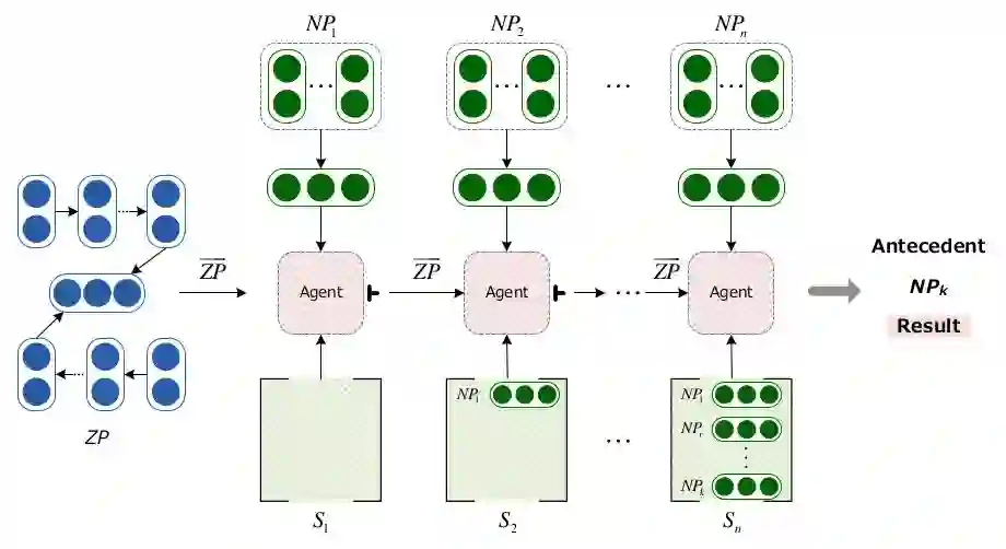 传统的零指代方法主要分为两个步骤:零代词的可消解性识别和零代词的消解。在这篇文章中,同已有的方法啊类似(Chen and Ng, 2016; Yin et al., 2017a; Yin et al., 2017b),我们主要关注第二个子任务,即零代词的消解。图2是本方法的整体流程图。对于一个给定的零代词,我们首先选取它所有的候选先行词,并将其映射成序列,从左到右依次与零代词进行分类。如果一个零代词和候选先行语被分为了可消解类别,那么我们就将这个零代词的信息保存起来,供后边的零代词消解使用。如果没有被选中,则将其舍去。在这个过程中,我们利用了基于策略梯度的深度强化学习算法进行零代词的选择。每一时刻,我们的状态定义为输入的零代词和对应时刻的候选先行语以及之前判断出的所有先行语,动作定义为选中和未选中两个动作--选中代表零代词和候选先行语可以消解。这样,我们就可以利用强化学习的方法进行零代词的消解工作。下边来详细介绍强化学习模型
