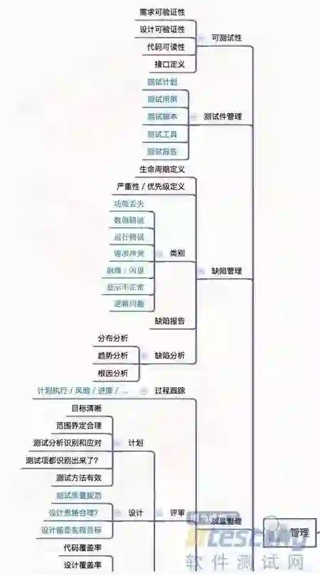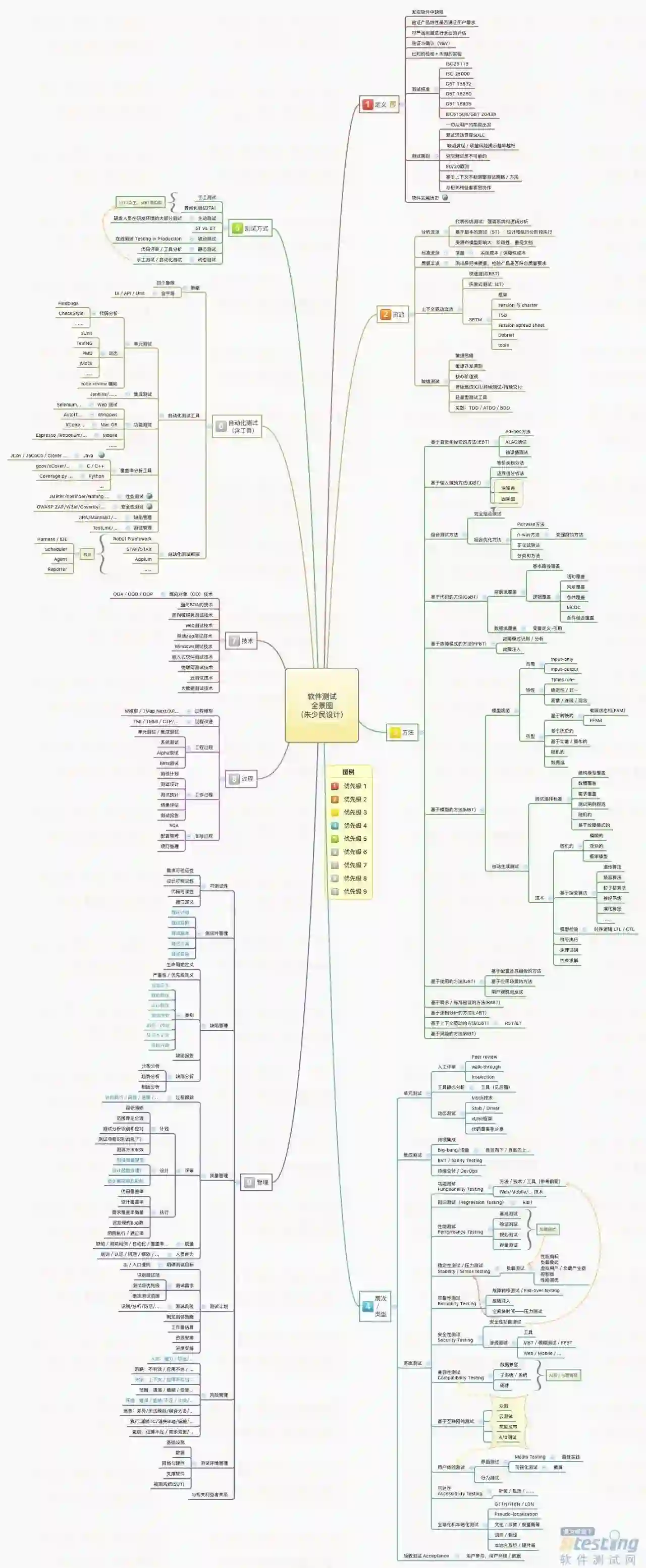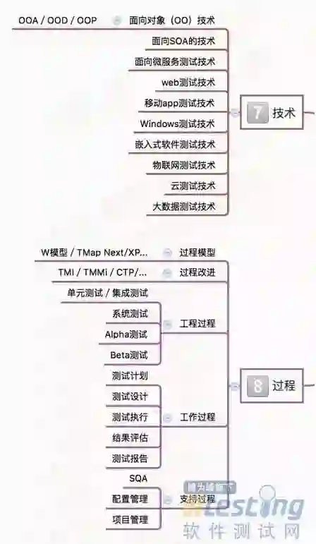 “软件测试全景图”整个思维导图有9个模块,分别是: