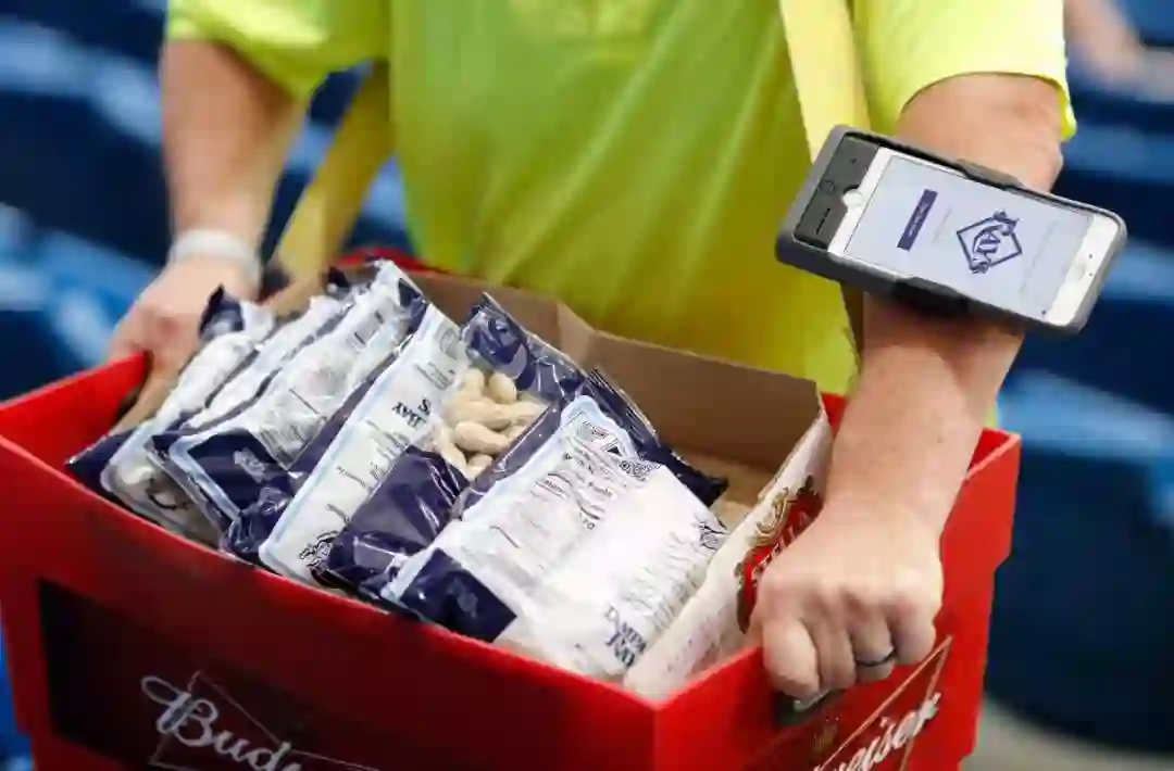 在佛罗里达州热带球场的一场棒球比赛中,一名商贩使用无现金系统完成了一笔交易。图片来源:Mike Carlson—Getty Images