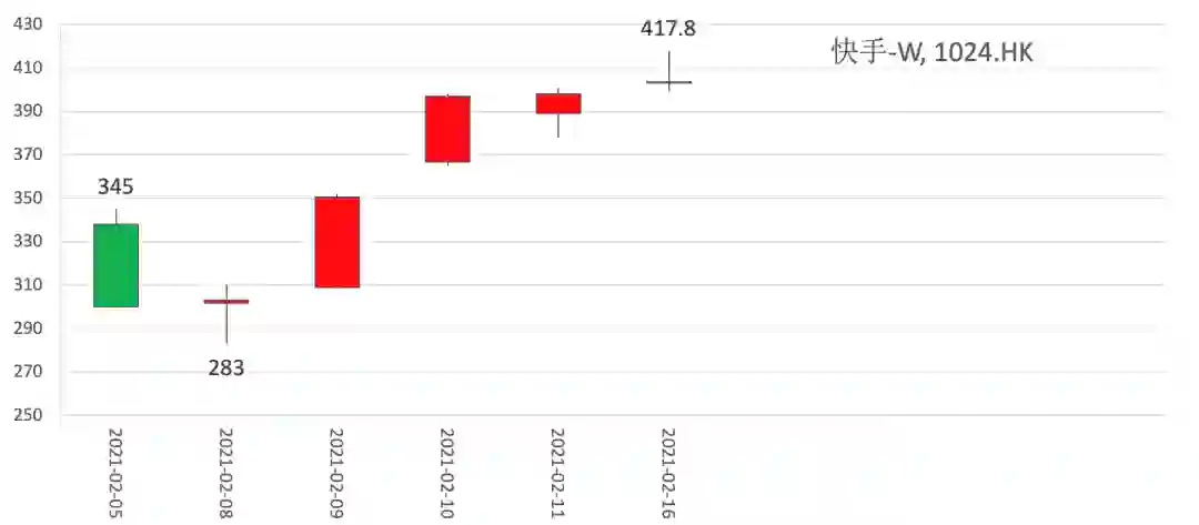 由于,打新参与者众多,未中签的踏空者因为其需求性,而开启了恐慌性抢购,加大了市场波动。自快手上市交易以来,成交价格始终维持高位,最低也只到过283港元/股。2月16日,春节后第一个交易日,报收403港元/股,对映的是1.68万亿港元的市值,创下新高。