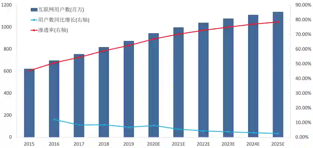 根据艾瑞咨询数据,2019年,我国的移动互联网用户数高达8.73亿,是全球最大的互联网用户群体,约占全球互联网用户数的23%。到2025年,我国的互联网用户数或将超过11亿,渗透率也将高达78.5%。