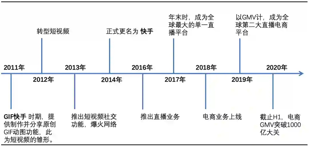 根据公司业务开展的时间线,最初在2011年,斗图文化盛行,快手还叫GIF快手时,主要提供制作原创GIF动图并分享的功能,这构成了短视频的雏形,可以说是流量积累之始。