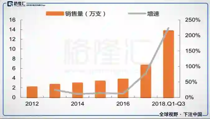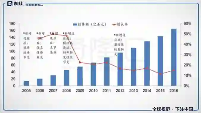 但是反观中国市场,2017年国内TNF-α抑制剂药物市场规模估计不到20亿元,占类风湿关节炎药物市场的比例不到20%,与全球市场相比简直是天壤之别。