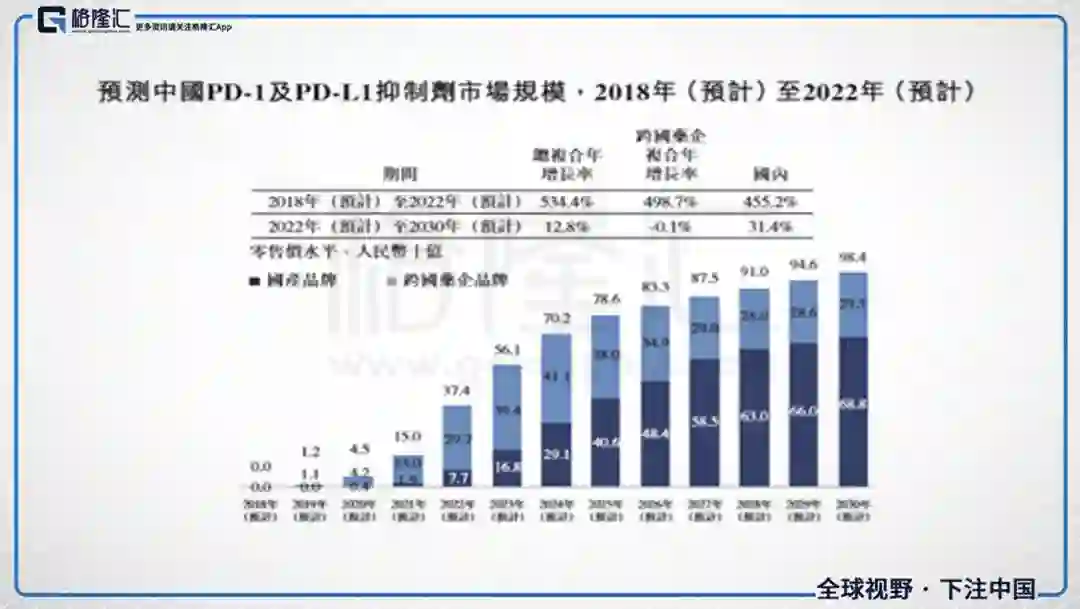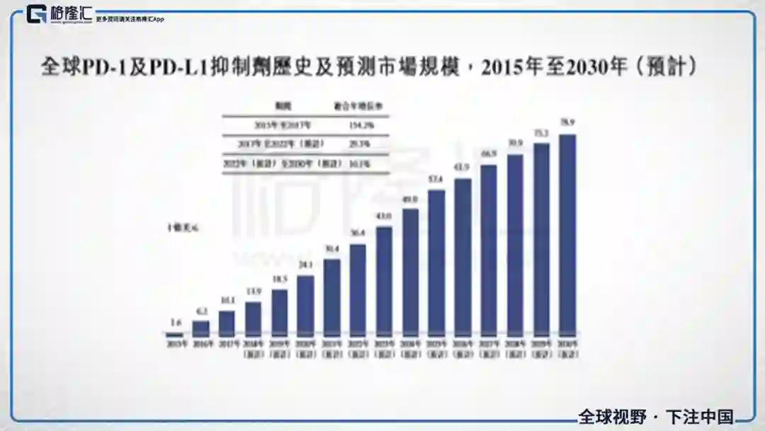 首先看一下“抗癌利器”PD-1单抗,根据F&S预测,到2030年全球PD-1/PD-L1抑制剂的市场规模将达到近800亿美元,而中国市场也将达到1000亿元。