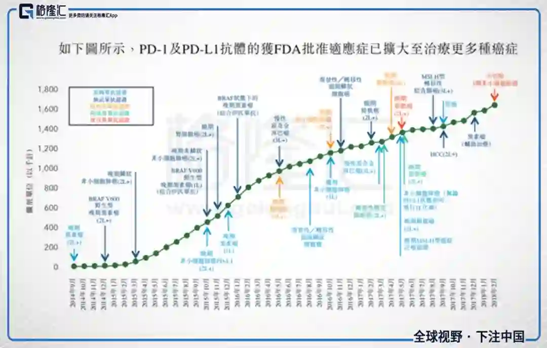 以已经在国内上市的PD-1单抗O药(Opdivo)和K药(Key truda)为例,二者之所以能在短短三年时间就在全球市场合计实现近100亿美元的年销售额,远超其他几个PD-L1单抗的市场规模,而且现在仍然有很高的增速,主要就是相比其他免疫治疗药物,O药和K药能不断获批新的适应症。