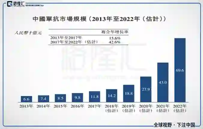 根据F&S预测,全球生物药市场将从17年的2402亿美元增长至22年的4040亿美元,CAGR为11%;而中国生物药市场将从17年的2185亿元增长至22年的4785亿元,CAGR为17%,其中单抗市场将从17年的120亿增长至22年的700亿,CAGR为43%。