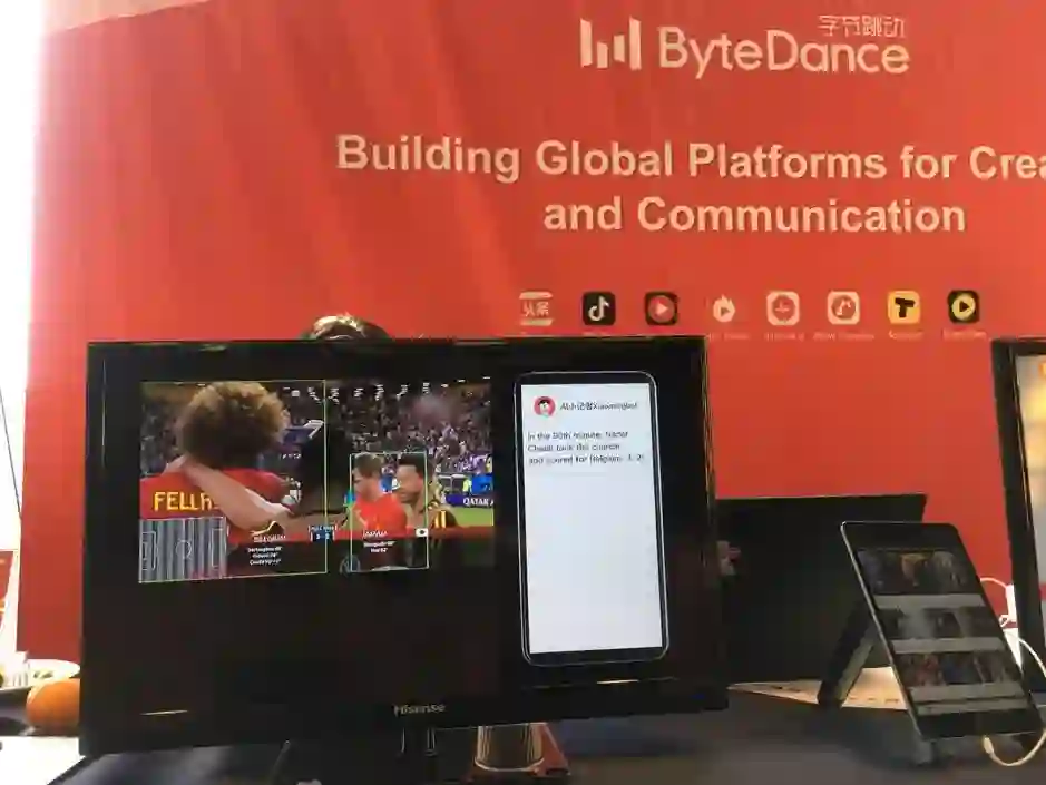 在休息时走出报告的会场,可以看到有很多企业的展台,其中许多企业通过各种形式的 DEMO 来展示自己的技术和业务,让参会者们有机会了解到产业界的状况和关心的问题。 例如旗下有今日头条、抖音等产品的字节跳动(ByteDance)公司,他们以小明机器人(Xiaoming Bot) 为世界杯比赛自动写稿为例,展示了计算机视觉与自然语言处理技术的结合。其中,小明机器人首先通过基于计算机视觉的足球比赛理解技术能对视频中的球员、足球甚至人物的表情进行实时的追踪、分割和理解,而后结合自然语言处理技术自动生成图文并茂的新闻稿。