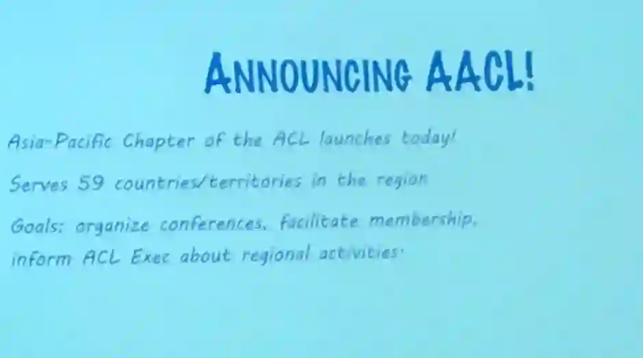 第二天日程由大会开幕式开始。在开幕式中,大会主席 Marti Hearst 宣布成立 AACL(The Asia-Pacific Chapter of the ACL)的决定,引发现场一片欢呼。区别于现有的针对于欧洲地区的 EACL(The European Chapter of the ACL)和北美地区的 NAACL(The North American Chapter of the Association for Computational Linguistics),此次成立的 AACL 会主要聚焦于亚太地区。