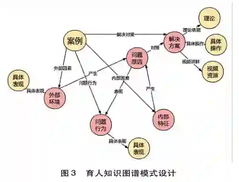 模式设计是知识图谱构建流程的核心环节,它从根本上表现为育人问题的解决逻辑。如上所述,AI好老师聚焦的问题常为孩子出现的问题行为。杰西卡•丹尼斯等(Dennis,2005)指出,个体发展是个体特征与环境因素相互作用的结果。也就是说,孩子出现问题行为是孩子的个体特征和外部环境相互作用的结果,而这些个体特征和环境因素的综合作用会使孩子产生某种诉求,从而表现出相应的问题行为。因此,追本溯源,找到问题发生的根本原因,形成相应的解决方案,是问题解决的重要环节。基于上述逻辑,本研究从孩子的问题行为出发,通过对内外部影响因素的探究查找相应的解决方案,同时关联相关案例和资源等,帮助用户更好地理解育人问题的解决逻辑与途径(见图3)。