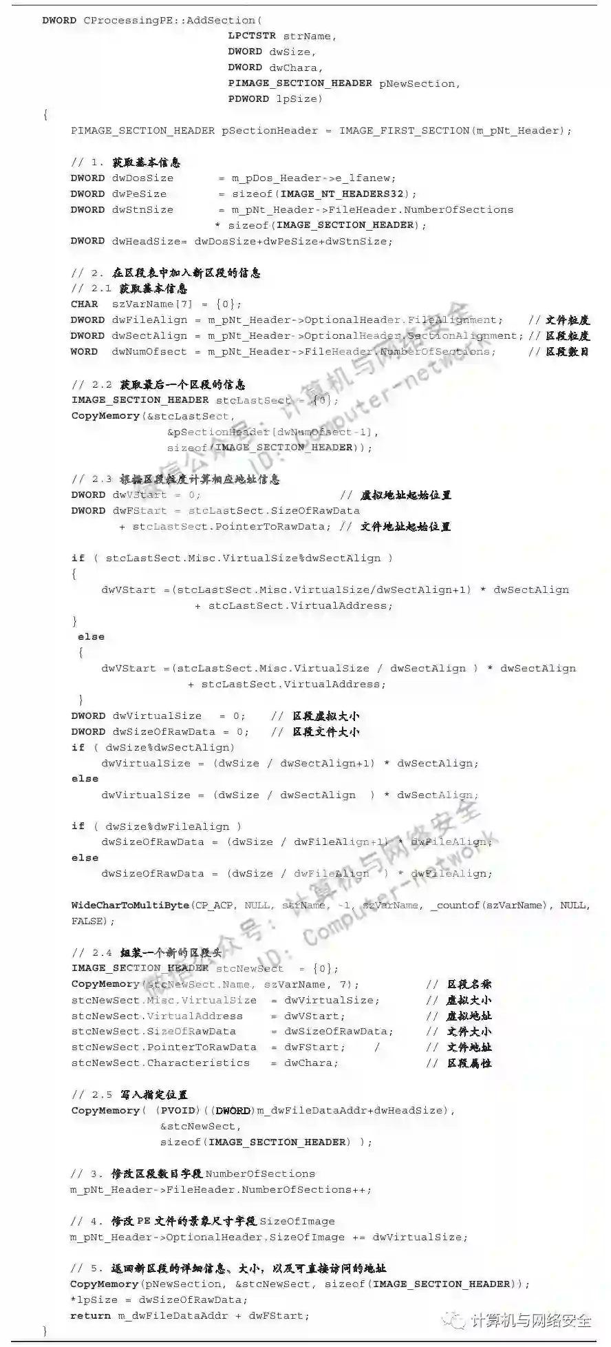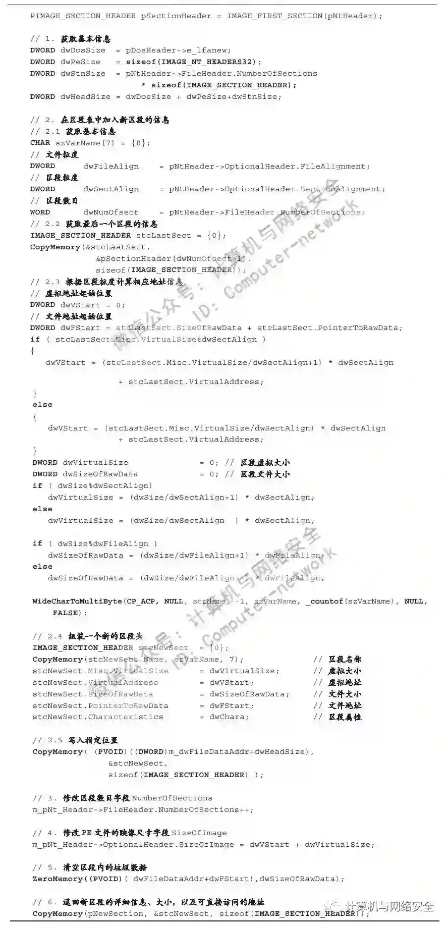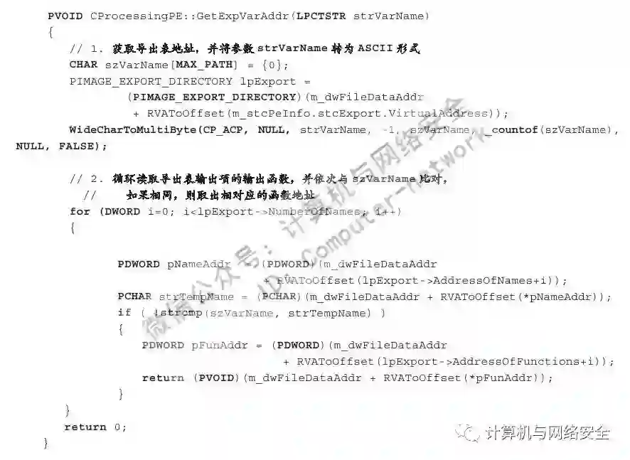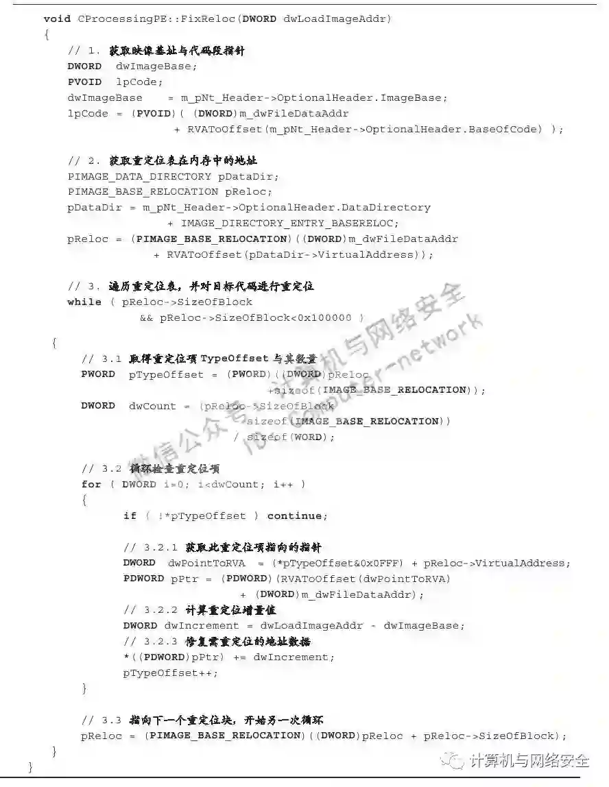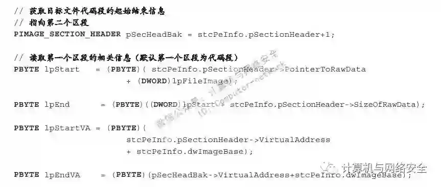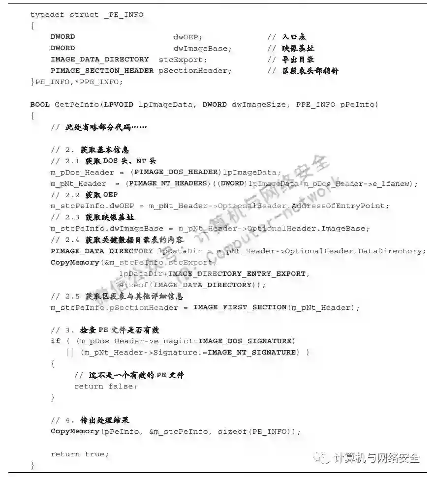 对于以上代码需要注意的是,某些变量如代表PE结构中NT头指针的pNtHeader与代表Dos头指针的pDosHeader等变量出于篇幅考虑,其来源并未给出。但是我们可以根据变量名简单地猜测其用途,这并不影响我们理解整段代码的意思。