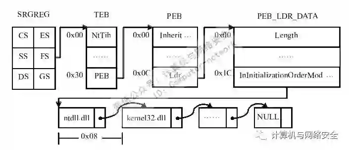 获取kernel32.dll加载基址的公开方法目前有3种:一种是通过特征匹配的暴力搜索;另一种是利用系统的SEH机制找到kernel32.dll并搜索出加载基址;最后一种则是通过线程环境块TEB的信息逐步找到kernel32.dll的加载基址。在以上3种方法中,代码量最少的就是最后一种方法,这也是我们将要介绍的方法。应用这种方法的具体思路如下: