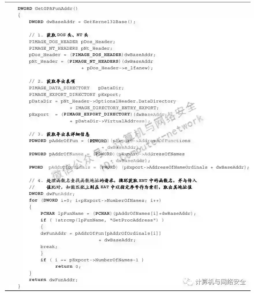 找出GetProcAddress函数地址的整个过程其实就是简单地对PE文件的导出表进行遍历查找操作,如果你对PE文件有一定了解的话,那么整个过程其实还是比较简单的。
