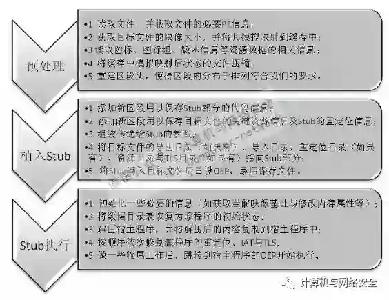 对于加壳部分的设计,其主要的难点在于对宿主程序数据的逻辑处理问题,我们要时刻清楚需要提取什么、需要删除什么以及目的是什么,这就要求我们要对加壳的执行流程与逻辑有一个基本的概念。