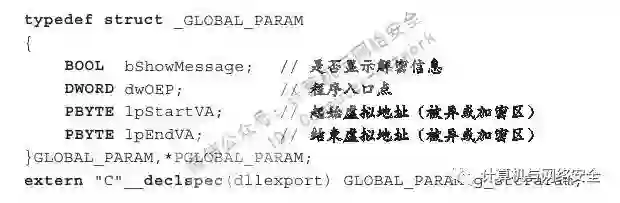 通过以上代码可知,我们定义了一个名为GLOBAL_PARAM与PGLOBAL_PARAM的结构体类型,并用GLOBAL_PARAM类型定义了一个被导出的全局变量g_stcParam。