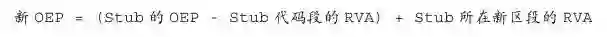 但是在最后计算OEP的过程中,要注意Stub的PE文件中所保存的OEP不能直接拿来用,因为Stub的代码段被移动了位置,其RVA已经发生了变化。因此将这些因素考虑进去后,我们可以得出以下公式: