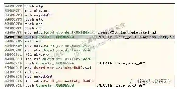 从图10中可以看到,除了函数入口处的"Decrypt()Function Entry!"提醒我们已经进入Decrypt函数外,还有Decrypt()_01等标记函数中的关键点,这样我们就能迅速地在反汇编代码中定位到关键点,从而使我们的调试工作更加轻松可靠。