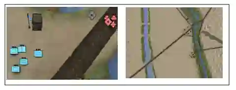 作为DSI的一部分,一个SC2LE地图是根据Tiger Claw OPORD和支持文件开发的(图3)。通过重新绘制图标以纳入2525B军事符号和与虎爪计划相关的单位参数(武器、范围、比例),游戏被军事化。内部评分系统被重新使用,以计算RL的奖励函数,其中包括任务目标的收敛(穿越瓦迪),蓝色损耗的最小化,以及红色损耗的最大化。