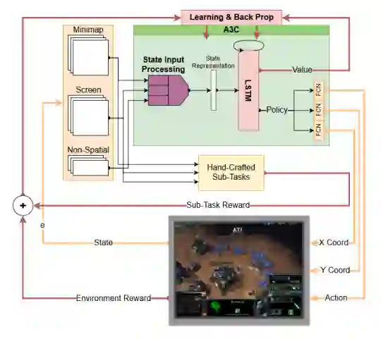 星际争霸II》是一个复杂的实时战略游戏,玩家要在高水平的经济决策和低水平的个人控制可能的数百个单位之间取得平衡,以压倒和击败对手的部队。星际争霸II》对人工智能有许多困难的挑战,使它成为MDO中C2的一个合适的模拟环境。例如,游戏有复杂的状态和行动空间,可以持续数万个时间步骤,实时选择数千个行动,并由于游戏的部分可观察性或 "战争迷雾 "而捕捉到不确定性。此外,该游戏具有可用于MDO模拟的异质资产、固有的C2架构、嵌入式军事(动能)目标,以及与更强大的模拟(例如,One Semi-Automated Force [OneSAF])相比,实施/修改的学习曲线较浅。DeepMind的SC2LE框架将暴雪娱乐公司的《星际争霸II》机器学习应用编程接口暴露为RL环境。这个工具提供了对《星际争霸II》和相关地图编辑器的访问,以及RL智能体与《星际争霸II》互动的接口,获得观察和发送行动。