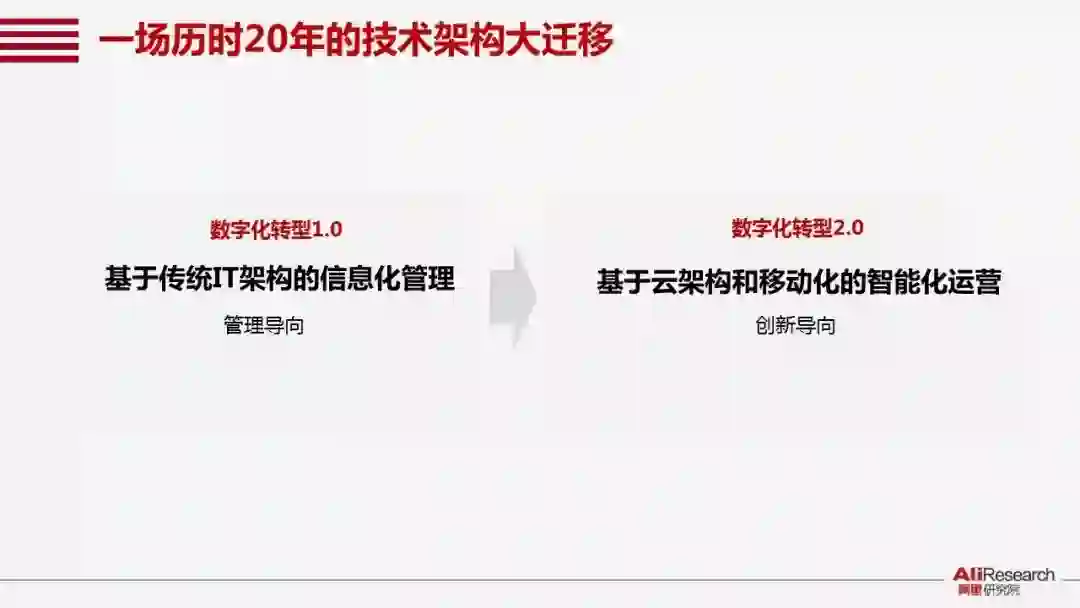 关于激进路径,数字化转型1.0时代,人们面对是技术架构不统一、维护高成本,烟囱式系统建设、数据共享困难,业务响应周期长,以内部资源优化为主、无法满足外延客户运营。从传统的IT架构向云架构迁移,是基于云计算、边缘计算、新型数据库等新技术的发展以及软件开发体系的持续迭代,传统应用软件加快向云端迁移,可以构建基于云架构的数据集成解决方案,更容易实现数据的集成、业务集成,实现技术架构统一、自动化运维,加速能力沉淀,快速敏捷响应客户需求,构建以用户运营为导向新架构体系。这是数字化转型2.0。这并不意味着云化后就自然解决了数据集成问题,但云化为集成问题创造了一条更加高效、低成本的解决思路。