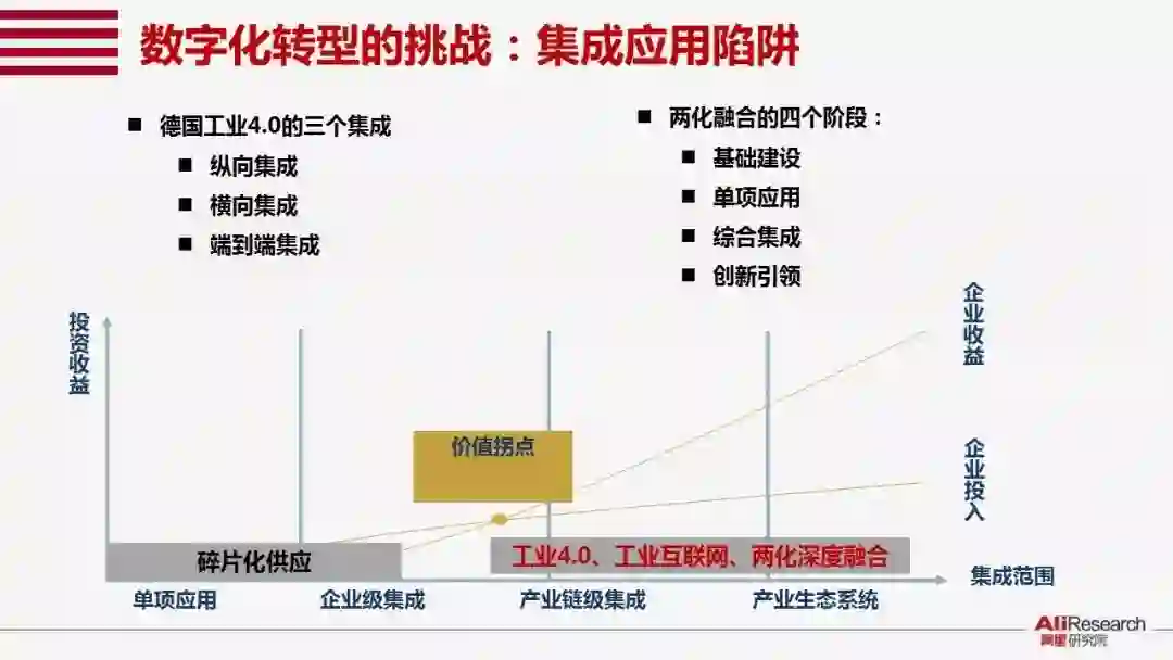 五年前我曾经创造了一个词——“集成应用陷阱”,“陷阱”这个概念来自“中等收入陷阱”,当一个国家人均GDP从1万美元跳跃到3万-4万美元的时候,跳不过去,这叫做“中等收入陷阱”。在企业数字化转型进程中也面临同样的问题。企业从财务管理、客户关系管理、企业资源管理、供应链管理等单项应用,跳跃到全流程、全场景、全生命周期应用,非常困难,所以叫做“集成应用陷阱”。